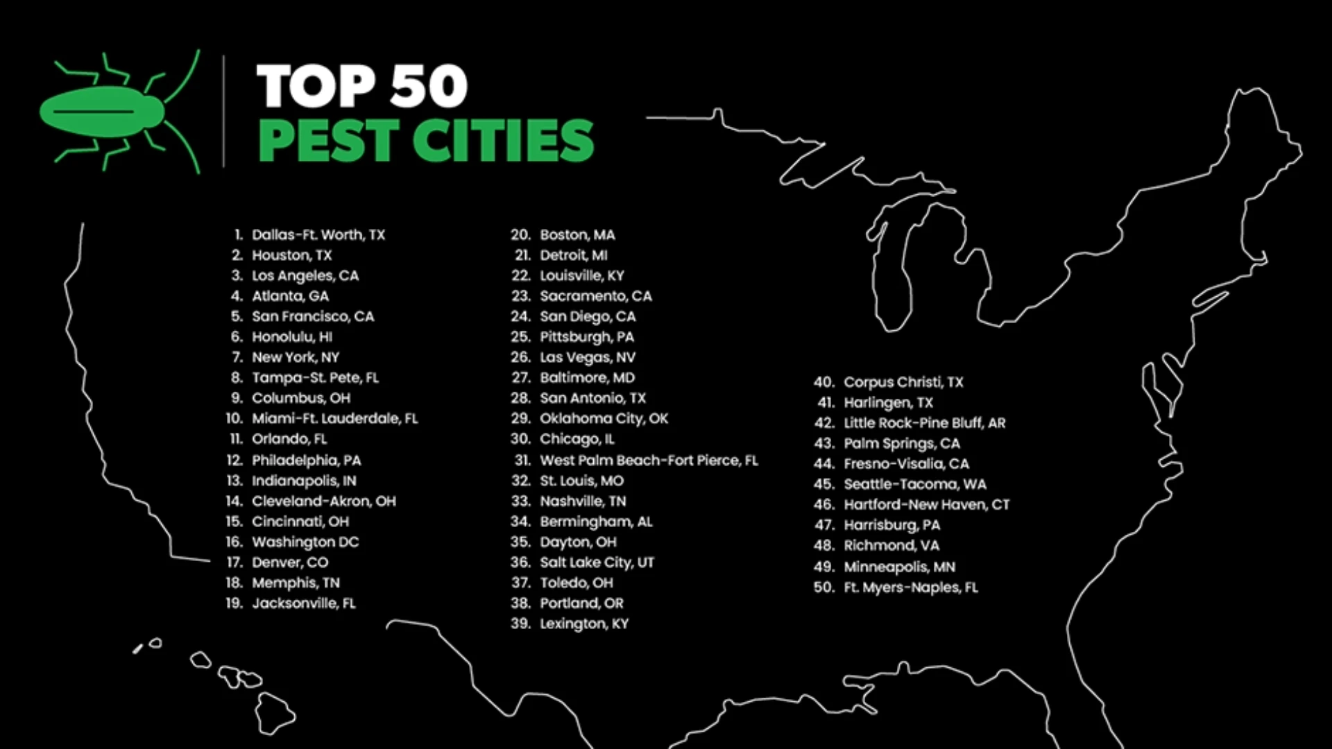 Terminix announced its top pest cities for U.S. businesses. Utilizing data collected between October 2023 and September 2024, Terminix identified cities where businesses most often used its commercial pest control services within the company's designated market areas.