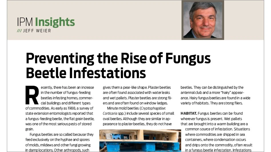 Recently, there has been an increase in the number of fungus-feeding beetles infesting homes, commercial buildings and different types of commodities. As early as 1988, a survey of state extension entomologists reported that a fungus-feeding beetle, the flat grain beetle, was one of the most serious pests of stored grain.