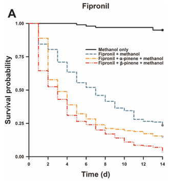 Behavioral study results showed that treatment with pinenes increased the likelihood that drywood termites would leave their original aggregation site and contact the treated part of the gallery. When tested with pesticide products applied in a small area away from the termite aggregation, β-pinene significantly sped up the termite control for the water-based fipronil treatment (Fig. 1). The efficacy of borate dust (disodium octaborate tetrahydrate) was not affected by the addition of pinenes. To find optimal combinations for localized insecticide injection, more work must be done to understand the relationships between different active ingredients/formulations and pinenes.