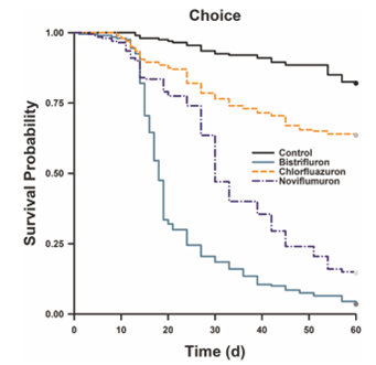 In the second project, we explored the potential of chitin synthesis inhibitors (CSIs) for controlling drywood termites. CSIs are a group of insect growth regulator that disrupt the production of chitin, an important component of insect exoskeleton. Specifically, we evaluated bistrifluron, chlorfluazuron and noviflumuron for their toxicity and ability to transfer horizontally among western drywood termites when applied to wood. In a no-choice bioassay, where termites only had access to treated wood, bistrifluron caused significantly faster death than chlorfluazuron or noviflumuron at 0.1% and 0.5% (wt/wt) over 60 days, achieving 99% mortality. In a choice bioassay, with both treated and untreated wood available, using 0.1%, bistrifluron still caused faster death than the others over 60 days, with 96% mortality (Fig. 2). In a transfer bioassay, a group of termites fed bistrifluron, called donors (D), was placed with unexposed nestmates, called recipients (R). Based on visual markings, the food from donor termites was quickly transferred to recipients within 24 to 48 hours (Fig. 3). Overall, survival patterns were similar between 1:19 (5% donor) and 10:10 (50% donor) D:R ratios, both reaching 100% mortality by day 90. This shows that even with limited numbers of termites that ingested the compound, lethal amounts of bistrifluron were retained and effectively transferred.