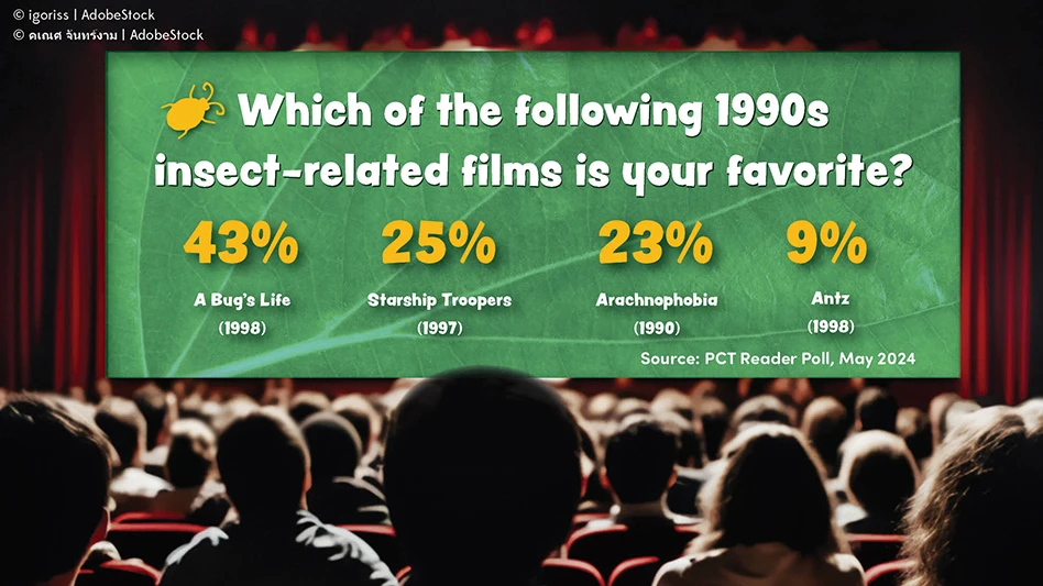 CLEVELAND – Some of the most popular insect-related films were released on the big screen during the 1990s. Results from PCT’s recent reader poll found that “A Bug’s Life” (43 percent) was the favored insect-related film from the 1990s.