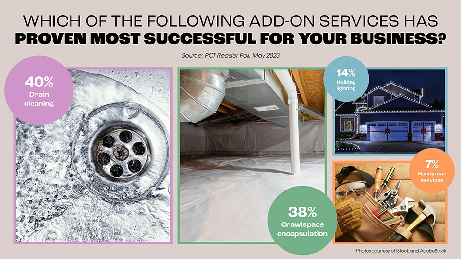 Fourteen percent of those who responded to PCT’s poll said holiday lighting was their most successful add-on service. Bill Cowley, owner of Cowleys Pest Services, Neptune City, N.J.. said holiday lighting has helped his company “fill a desperate four-month slow period” of November to February. It has “filled this gap and kept the cash flowing through this slow period,” he said.