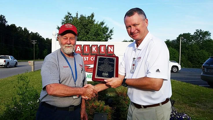 Pictured: Ronnie Golding (left) accepts a plaque, congratulations, and other rewards from Scott Heath (right), co-owner of Aiken Pest Control in recognition of his 50th anniversary with the company.