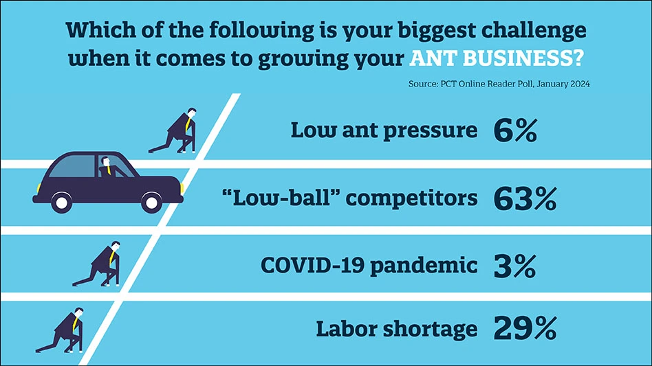 But the ant control market is not without its challenges, including low-ball competitors. According to the most recent PCT Reader Poll, 63 percent of respondents said “low ball” competitors presented the biggest challenge when it comes to growing their ant control business. Twenty-nine percent cited the labor shortage, six percent cited low ant pressure and another three percent said COVID-19 pandemic.