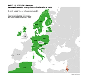 The non-profit honey bee research association COLOSS (prevention of honey bee COlony LOSSes), which comprises more than 360 scientific professionals from 60 countries, has published new data showing that the overall mortality rate of bees in the 2013/2014 winter was nine percent – in Europe, losses below 10 percent are considered to be normal. This compares with losses between 30 and 34 percent in the UK and Belgium during the 2012/2013 winter season.