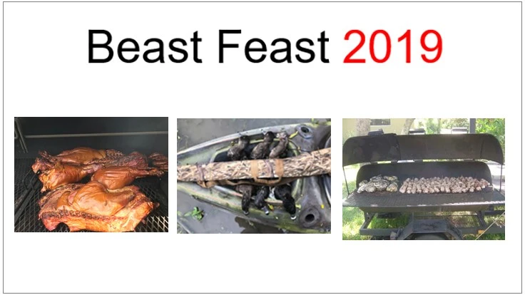 Attendees should bring a side dish such as salad, beans or dessert and whatever they like to drink (alcohol is permitted in the River House). Dinners will be served at about 5 p.m., and Blue Cypress Bluegrass Band will play from 6-9 pm. There will be dove, duck, snipe, quail, wild hog, deer, pheasant, fish, alligator, and more. There will also be hot dogs and hamburgers.