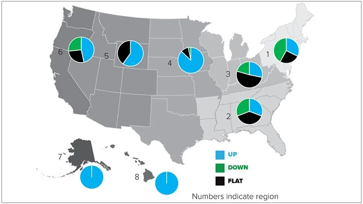 Usually, as temperatures drop so does bed bug activity, and this trend held true all along the east coast and as far west as Louisiana and Wisconsin. However, a swath in the center of the country starting in Minnesota and North Dakota and moving due south through Texas reported a shocking statistic — 87.1 percent of companies saw an increase in bed bug numbers. While the percentages were less dramatic moving towards the west coast, companies still bucked the expected trend and saw activity increase instead of decrease.