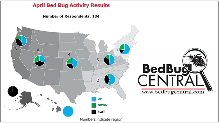 Bed Bug Central released results from its ongoing bed bug surveys. Results show that in April bed bug activity compared to March demonstrated a significant slow-down in bed bug business in the Northeast, a busy April for the Southeast and Eastern Midwest (Ohio, Michigan and Illinois) and a busier West Coast.