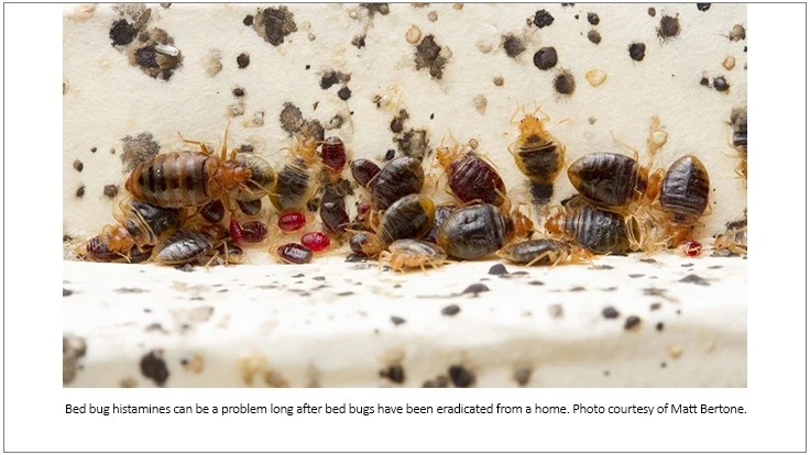 Using a Raleigh apartment complex as a study site, the researchers searched specific apartments for evidence of bed bugs and also for apartments not impacted by bed bugs, and then collected the household dust in both apartment types. Those with bed bug infestations had substantially higher histamine levels in dust than apartments with no evidence of bed bugs as well as “control” apartments some miles away that had no history of bed bug infestation.