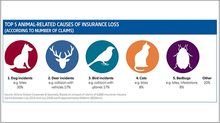 While dog incidents were the top animal-related insurance claim, by far the most expensive insurance claims result from bird incidents, which are the third most frequent cause of animal-related claims (1,146), AGCS reports. This is hugely influenced by one type of loss – bird strikes with airplanes – for which there have been over 900 claims in the past five years. The average bird strike claim costs around $368,000 in insured losses.