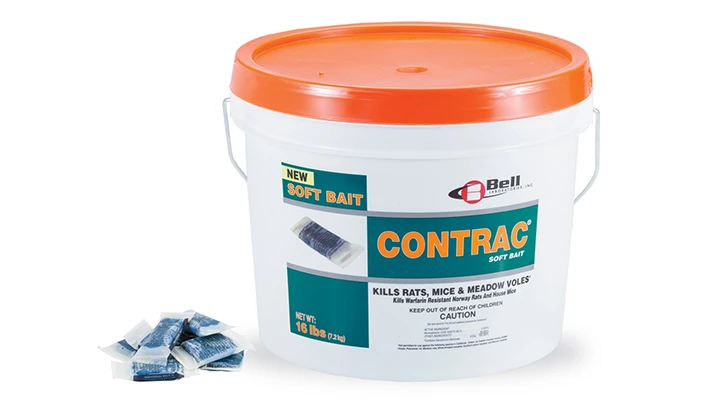 Contrac Soft Bait is available in an all-new 16 lb. pail size. This new Soft Bait pail is clearly differentiated from all other Bell Laboratories pails with an orange lid for ease of identification by distributors and PMPs. Contrac Soft Bait is available in 10g sachets with a minimum mouse placement of 10g and a minimum rat placement of 90g.