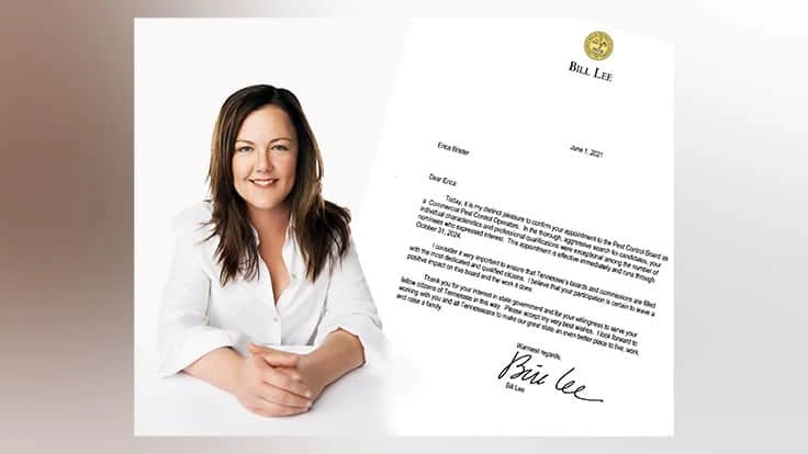 NASHVILLE, Tenn. - U.S. Pest Protection president and CEO Erica Brister was appointed to the Tennessee Pest Control Advisory Board by Tennessee State Gov. Bill Lee. The board influences laws and regulations in the state of Tennessee.