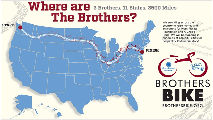Today marks the one week countdown until the Brothers Bike journey across America is complete. As most of you know, my dad and two uncles have spent the last seven weeks riding their bikes from Seattle to New York City to raise money and awareness for two charities that are very meaningful to our family, the Moss Pieratt Foundation and A Child’s Hope.