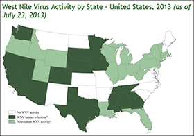 CDC also reported non-human WNV infections from the following states: Arizona, California, Colorado, Connecticut, District of Columbia, Florida, Idaho, Illinois, Indiana, Iowa, Louisiana, Massachusetts, Michigan, Minnesota, Mississippi, Nebraska, Nevada, New Jersey, New York, Ohio, Oregon, Pennsylvania, South Dakota, Tennessee, Texas, Utah, Vermont, Washington, West Virginia, Wisconsin, and Wyoming.