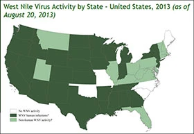 As of August 20, 2013, 43 states and the District of Columbia have reported West Nile virus infections in people, birds, or mosquitoes. A total of 296 cases of West Nile virus disease in people, including 11 deaths, have been reported to CDC. Of these, 145 (49%) were classified as neuroinvasive disease (such as meningitis or encephalitis) and 151 (51%) were classified as non-neuroinvasive disease.