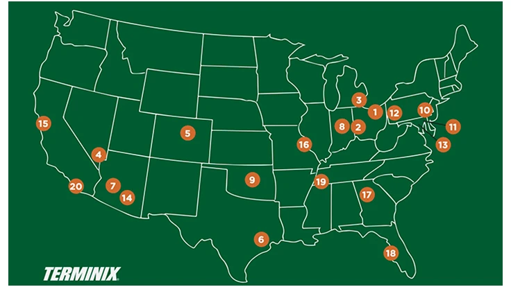 *This list was created by compiling actual services data from more than 300 Terminix branches across the country. The rankings represent Metropolitan Statistical Areas (MSAs) with the highest number of actual services between Jan. 1, 2017 and June 30, 2017.