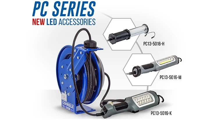 Coxreels has introduced a new line of three industrial duty LED lights now available on the PC13 (Power Cord) cord reels. The new LED lights feature a variety of industrial-grade features and options, including: a 50,000 hour rating, internal light diffusers, and shatter-resistant polycarbonate lenses. Coxreels’ new LED lights also feature adjustable steel hooks for hands-free placement.