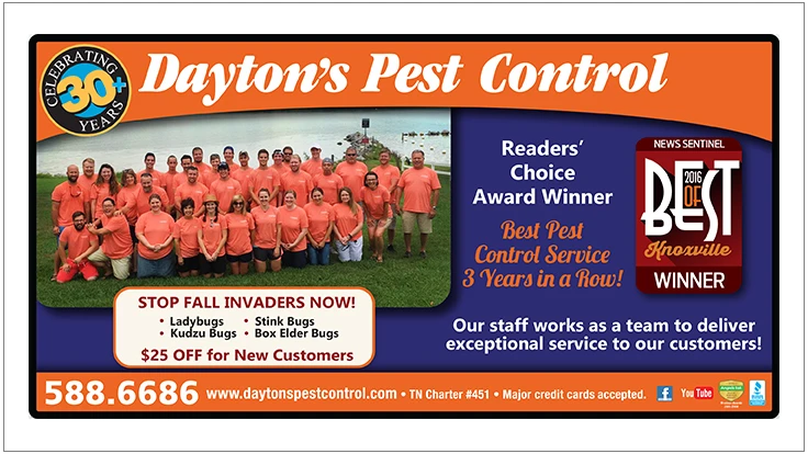 KNOXVILLE, Tenn. — Dayton’s Pest Control, Knoxville, Tenn., was recently named a “Best of Knoxville” award winner as selected by readers of the Knoxville News Sentinel. Dayton’s was voted #1 in the Pest Control category.