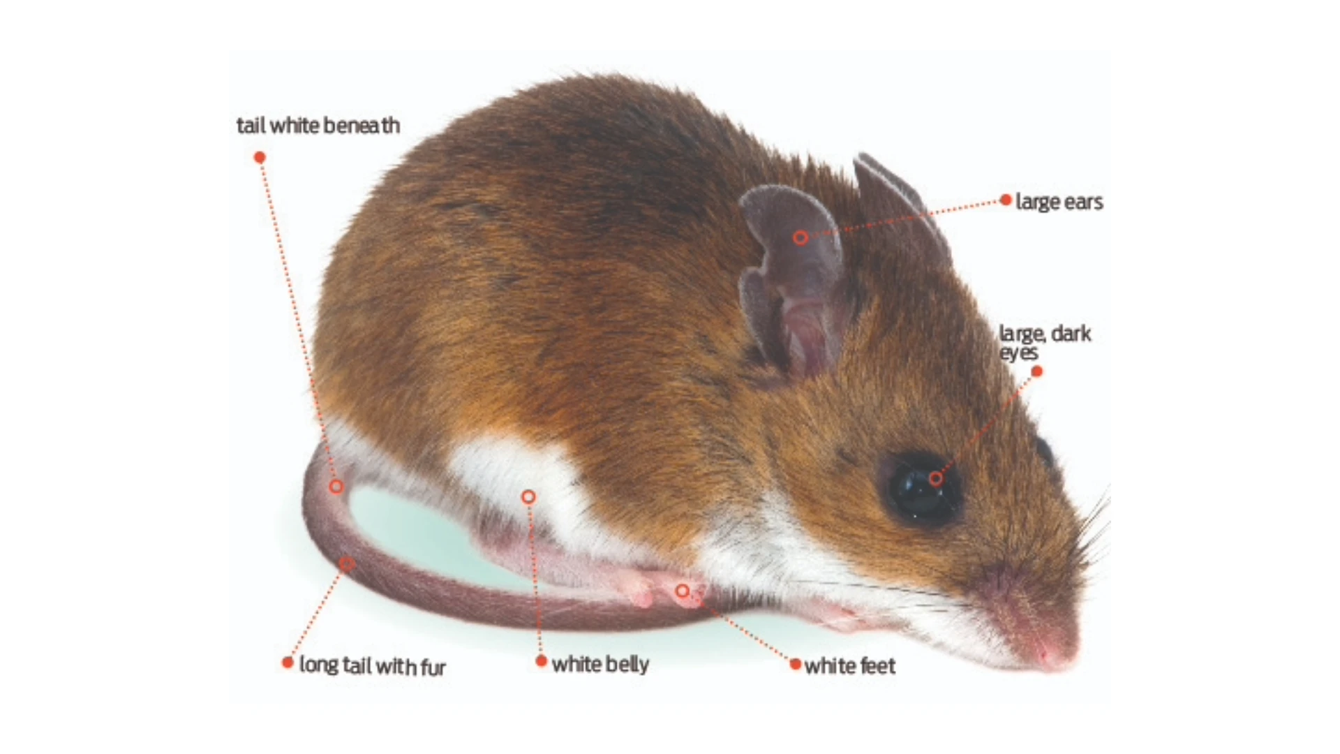 Physical Characteristics. The deer mouse and the house mouse are roughly the same size, but most people think the deer mouse is “cuter” with its large eyes and ears and two-tone fur. It gets its name because its coloration resembles that of the white-tailed deer — gray or tawny brown above and white below. The photo at left points out deer mouse features that are different from those of the house mouse.