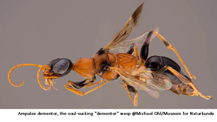 “A wasp that steals its prey’s free will with a single sting before eating it alive sounds like a monster straight out of a storybook. Visitors to the Berlin natural history museum Museum für Naturkunde (MfN) certainly thought so, voting to name this wasp Ampulex dementor after the soul-sucking dementors from the Harry Potter series.