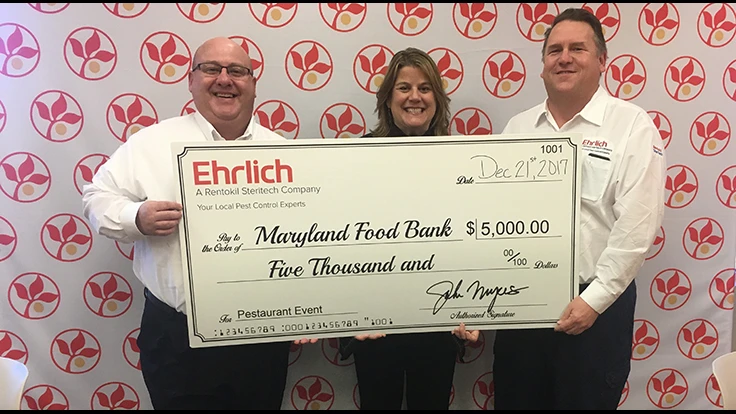 Ehrlich Pest Control has donated $5,000 to the Maryland Food Bank to support their ongoing initiatives. This donation came as a result of the pop-up “Pestaurant” event that occurred in late September at the Pratt and Light Plaza in Baltimore. At the event, passerby were invited to sample bug-infused dishes (i.e. June Beetles Encrusted Croquettes, Fried Cricket Crostini, Maryland Mealworm Crab Cakes, and Grasshopper Bark). For every person who tasted one of the bug infused dishes or entered the cricket eating contest, Ehrlich made a donation to the Maryland Food, resulting in this check presentation.