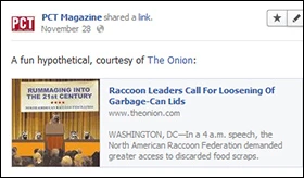 PCT's Facebook page highlighted satirical news website The Onion poking fun at pest control exclusion efforts in the posting 'Raccoon Leaders Call For Loosening Of Garbage-Can Lids.'