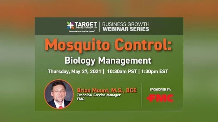 Description: Join FMC's Brian Mount and Target Specialty Products on Thursday for a mosquito control webinar that will explore the biology and management of common mosquitoes. Topics that will be discussed include the life cycle, behavioral ecology and distribution of mosquitoes, as well as a review of recommended chemicals for their control.