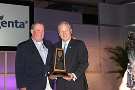 Tom Fortson (left) is presented the Pinnacle Award by NPMA President Billy Tesh (right). |