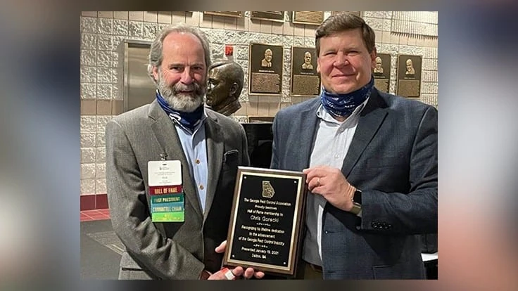 ATLANTA - Chris Gorecki, vice president of operational support at Rollins, was inducted into the Georgia Pest Control Association (GPCA) Hall of Fame on Jan. 13. Gorecki was recognized for his lifetime dedication to the advancement of the Georgia pest control industry. GPCA promotes the standards and ethics of the industry by providing ongoing education for the pest control industry, including the advancement of research.