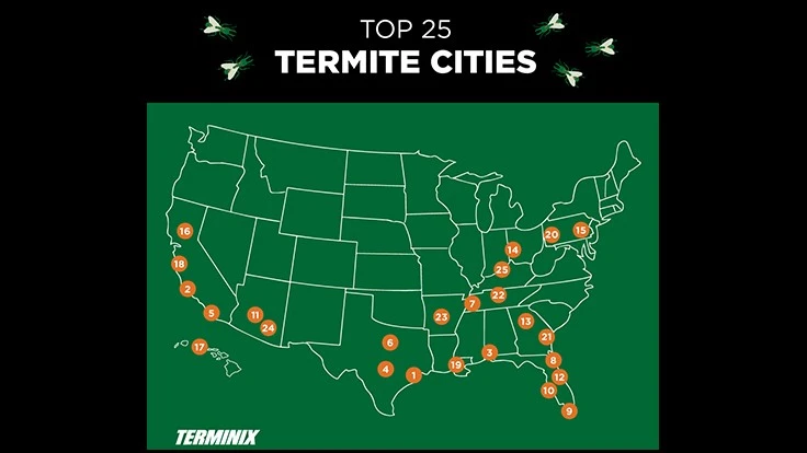 MEMPHIS, Tenn. — Terminix revealed the 25 most termite-infested cities in the country. Termites were most prevalent in Houston in 2017, followed by Los Angeles and Mobile, Ala.