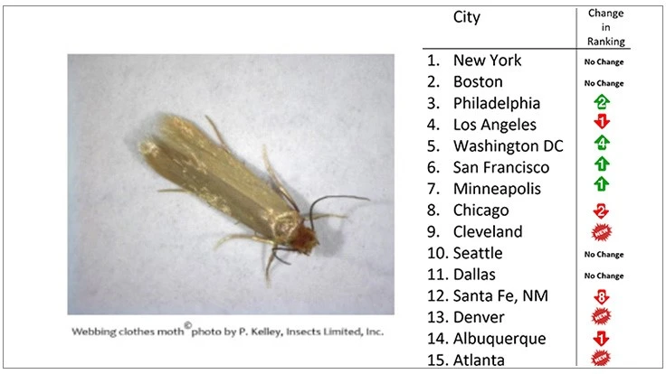 Which cities in the U.S. have the worst clothes moth problems? Here is your answer. For the 2nd year in a row, Insects Limited released a ranking of the top clothes moth cities in the United States. For 2018, the top two cities for clothes moth remain unchanged in New York City and Boston. This year, there were lots of new cities joining the list and a few that have dropped off.