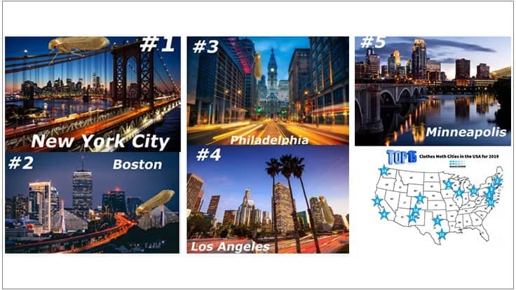 For 2019, the top four cities for clothes moth remain unchanged; New York City, Boston, Philadelphia and Los Angeles. Minneapolis inched up two spots to grab the final spot in the top five. The state of Texas made big leaps this year as Dallas moved up considerably, and Houston joined the list while Atlanta dropped off.
