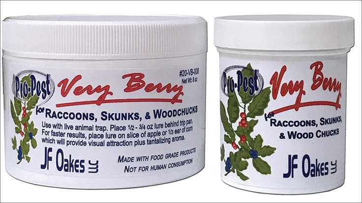 YAZOO CITY, Ms. — J. F. Oakes announced it is offering an aromatic Pro-Pest Very Berry Lure for raccoons, skunks and woodchucks. The Pro-Pest Very Berry Wildlife Lure is a multi-animal lure made with all food grade products that is enticing and tantalizing, J. F. Oakes reports. It comes in in 4 and 8 ounce wide-mouth jar. Pro-Pest Very Berry Wildlife Lure is in stock and ready to ship, J.F. Oakes reports.