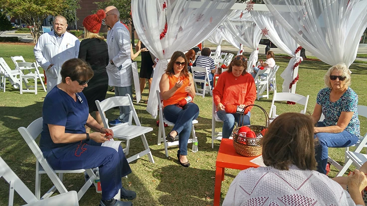Dedicated volunteers from across Central Florida came together at Florida Hospital’s Creation Park Lawn to knit and crochet red hats for the community’s littlest survivors. The event also featured live music and remarks from leaders of supporting organizations.