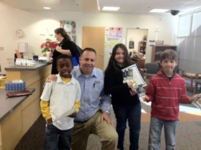 Killarney Elementary School “Massey Math Mile” winners, Elizabeth, Jayson and Zachary, celebrate with Paul Giordano in their classroom. |