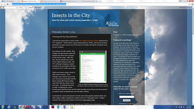 Mike Merchant, entomology specialist for Texas AgriLife Extension and Insects in the City blogger, recently had an opportunity to review PCT's new Distance Learning Center, the centerpiece of which is the new online label training program.