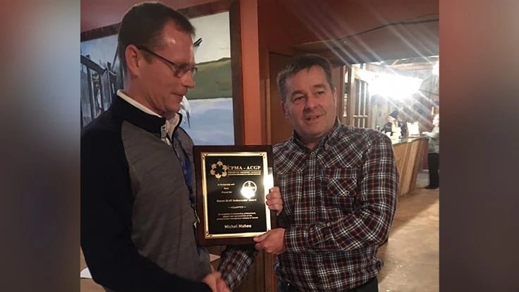 (Pictured: Bayer's Darcy Olds, left, presents the Steven Graff CPMA Ambassador Award to Michel Maheu, right.)
