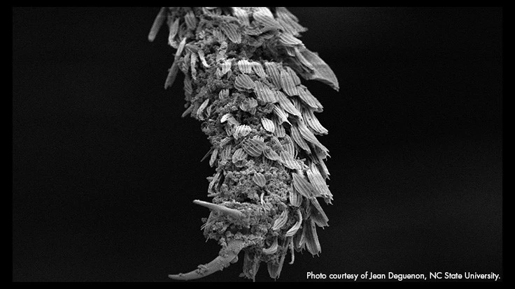 (Pictured: The lower portion of a mosquito's leg after contact with a volcanic rock powder. Statically transferred perlite particles dehydrate mosquitoes, killing them. Photo courtesy of Jean Deguenon, NC State University.)