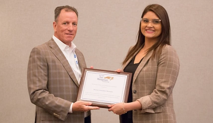 (Pictured: Maria Gonzalez receives her scholarship from Clint Miller, NCPMA president, at the 2020 NCPMA Pest Control Technician’s School.)