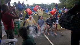 Phil Cooper of Cooper Pest Solutions (left), Garry Milsom of Delsea Termite and Pest Control (middle) and a USDA-APHIS-Wild Life Services volunteer (right) getting ice-bucketed for charity. Ryan Bradbury of Viking Termite & Pest Control helped do the soaking. |