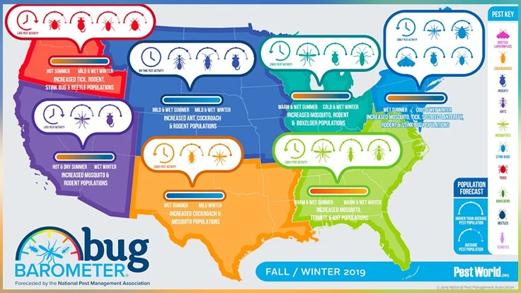 Based on this analysis, the National Pest Management Association’s Fall/Winter Bug Barometer is forecasting a spike in major pest populations across the entire U.S. this season: