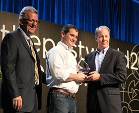 Justin McCauley (center) is presented with the NPMA Young Entrepreneur Award from John Myers (right) of Rentokil, and Kevin Pass (left) of NPMA. |