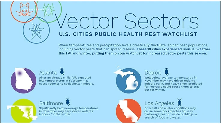 FAIRFAX, Va. — The National Pest Management Association (NPMA) released its bi-annual Vector Sectors list of the top 10 U.S. cities with the greatest risk for increased pest pressure from vector pests, including rodents and cockroaches, for the remainder of winter (download the infographic). As vectors of disease, these pests are able to transmit pathogens such as Salmonella and hantavirus to humans. They are also known to trigger allergy and asthma symptoms, especially in children, making awareness and prevention vital to protecting public health.