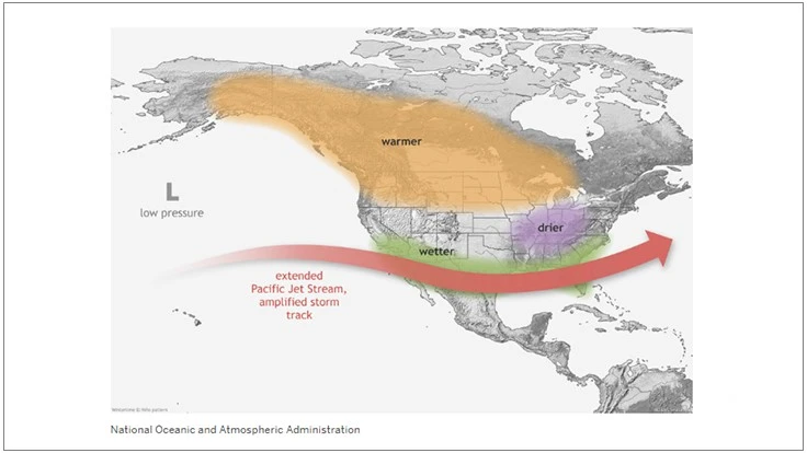 When the ocean temperatures are warmer, an El Nino occurs, leading to changes in wind patterns and in weather patterns across North America - generally causing drier conditions throughout much of the Midwest, and wetter conditions across the South.