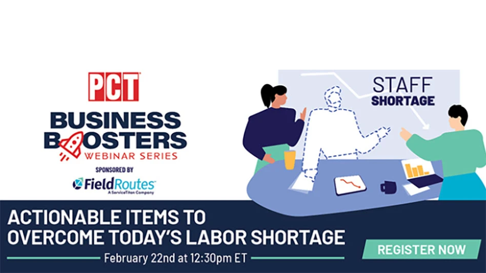 Register now for Wednesday's free webinar, taking place at 12:30 p.m. ET. The labor challenge is cited over and over as the No. 1 growth obstacle for pest management professionals. Join Phil Cooper, CEO, chief transformation officer and certified EOS Implementer at TRNZ4m, and Mark Stewart, strategic account executive at FieldRoutes, for Actionable Items to Overcome Today's Labor Shortage.