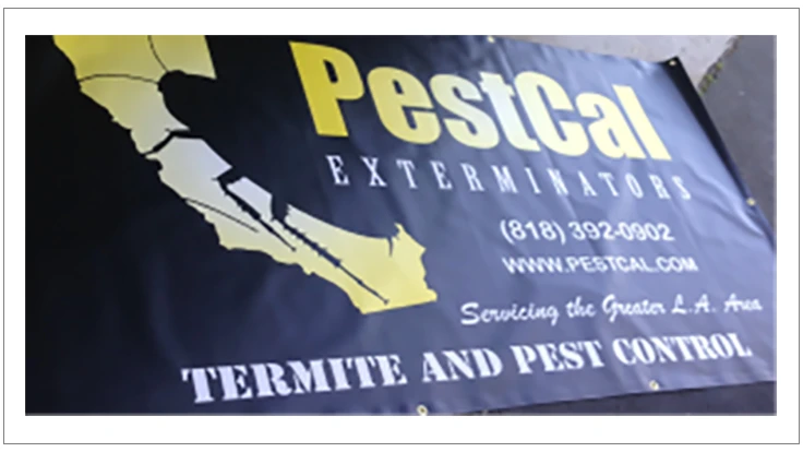 “I designed our company logo and this banner myself,” says Kevin Campos, owner of PestCal Exterminators. “One day, before I started this company, I was driving around and pictured a roach with the state of California. I haven’t seen that done for a logo yet, and I thought it would catch peoples’ eyes. I drew it up, and that’s the logo that you see today on our banner.”