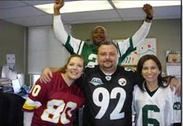 Left to right: Stuart Aust in a Jets jersey; Tim Periard in a Steelers jersey; Toni Corrigan in a Jets jersey; Christen Campisi in a Redskins jersey, and Celeste Hiciano in a Giants jersey.