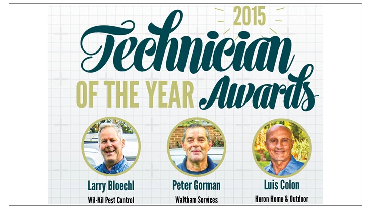 The annual awards, sponsored by BASF Pest Control Solutions, recognize a trio of service professionals in the residential, commercial and termite categories. The 2015 winners are Larry Bloechl, Wil-Kil Pest Control (residential category); Peter Gorman, Waltham Services (commercial category); and Luis Colon, Heron Home & Outdoor (termite category).