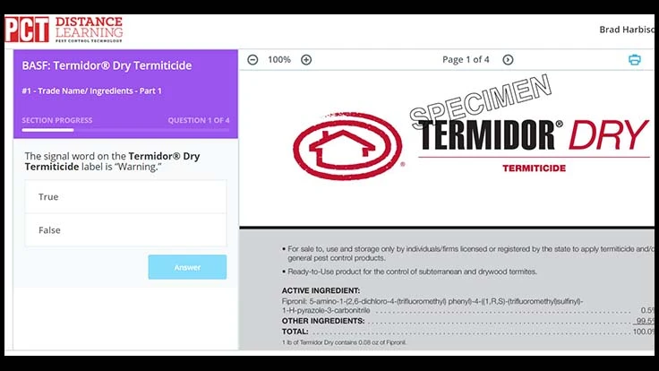 CLEVELAND, Ohio — PCT’s Distance Learning Center continues to expand with the addition of training module for four labels from BASF: Termidor Dry; Termidor Dry California; Termidor Foam; and Termidor NY. Visit https://training.pctonline.com and get started on the module.This and other label training modules are the centerpiece of PCT’s Distance Learning Center — a FREE service for the professional pest control market provided by PCT.