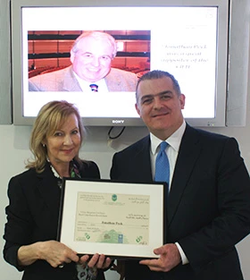 Also representing the global industry was Michel Bayoud from Boecker Public Health in the Lebanon. Michel talked of Jonathan’s knowledge and passion for the industry and his work in building bridges. As part of Jonathan’s legacy and following on from the NPMA organized PestWord East in Dubai last year he announced that there would be an outreach conference every three years and that the first will be in Beirut in 2016. There will also be an annual educational grant, the Jonathan Peck Award, for a Middle Eastern pest professional. Touchingly Michel also said that a Lebanon cedar tree had been planted in Jonathan’s memory and he presented Fionnula Peck with a special framed certificate about the tree.